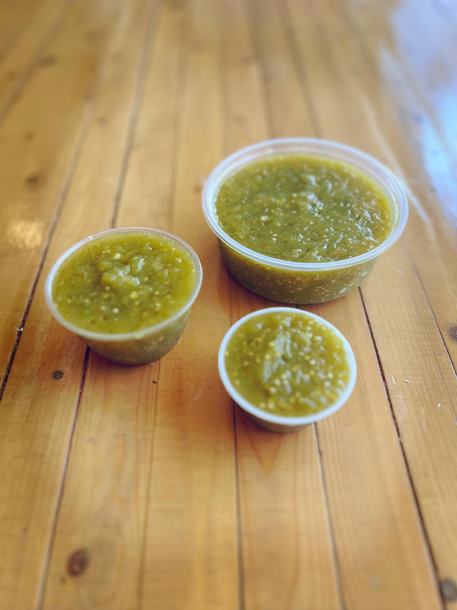 Roasted Tomatillo, Onion, Garlic, Arbol Chile. Made fresh daily in-house.