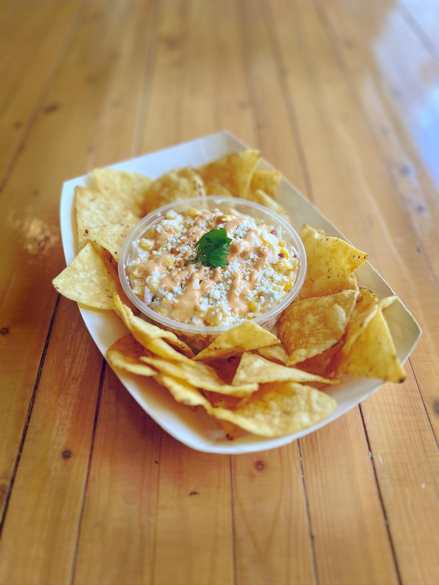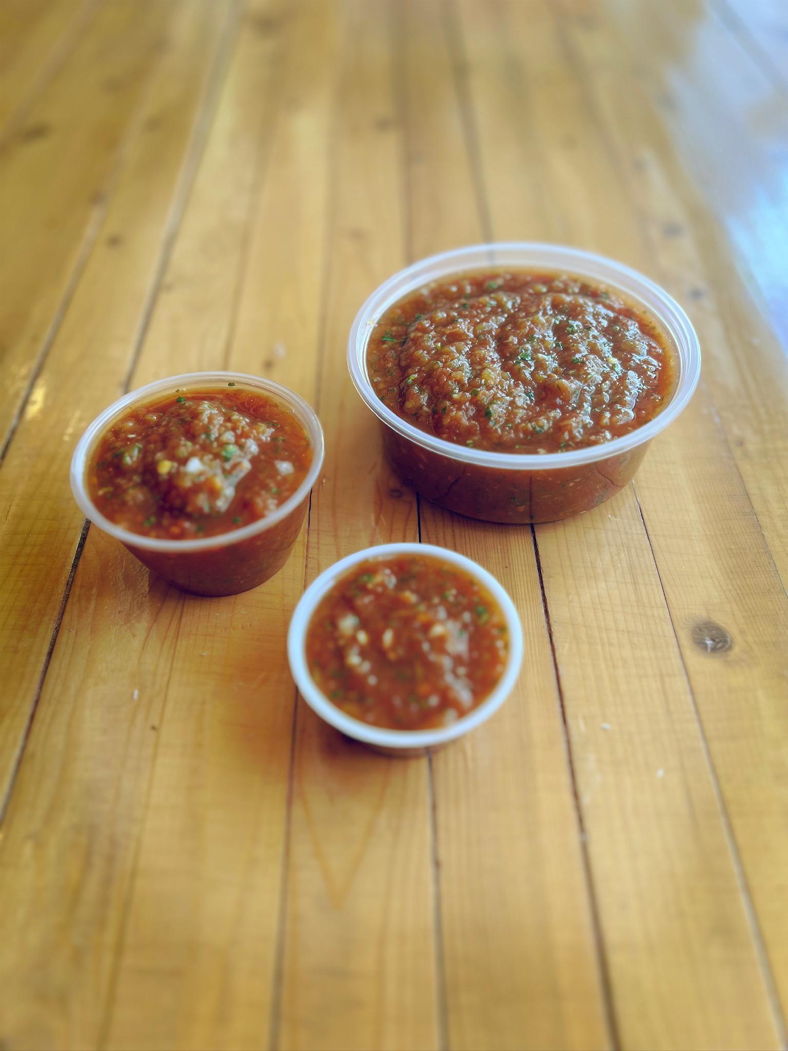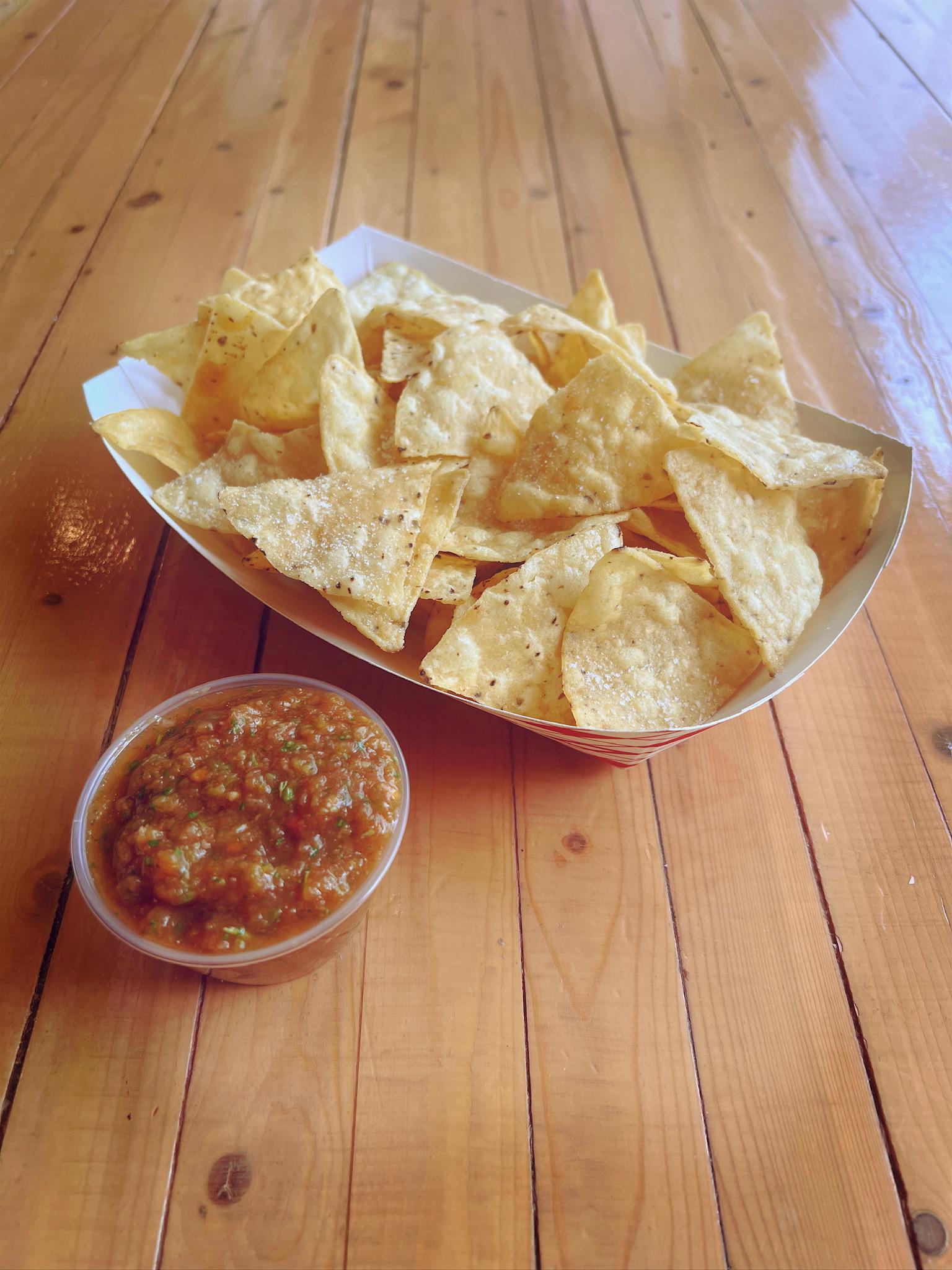 Freshly fried corn chips and four ounces of our hosemade salsa roja.
