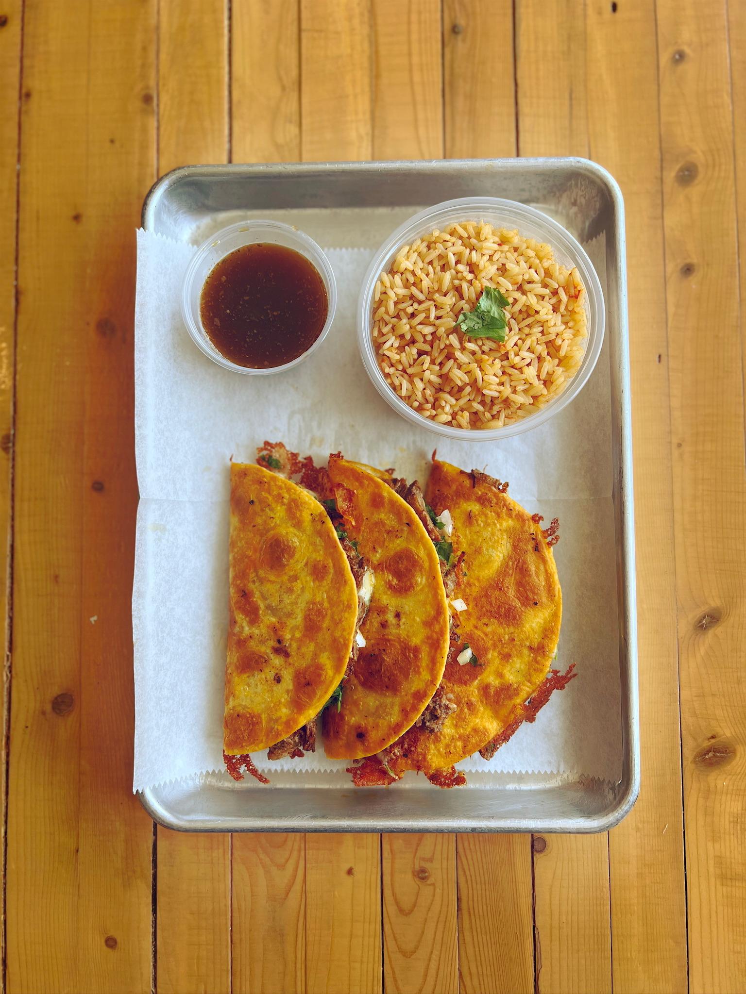 three small brisket birria quesadillas with onion cilantro and chihuahua cheese. side of rice and consomme