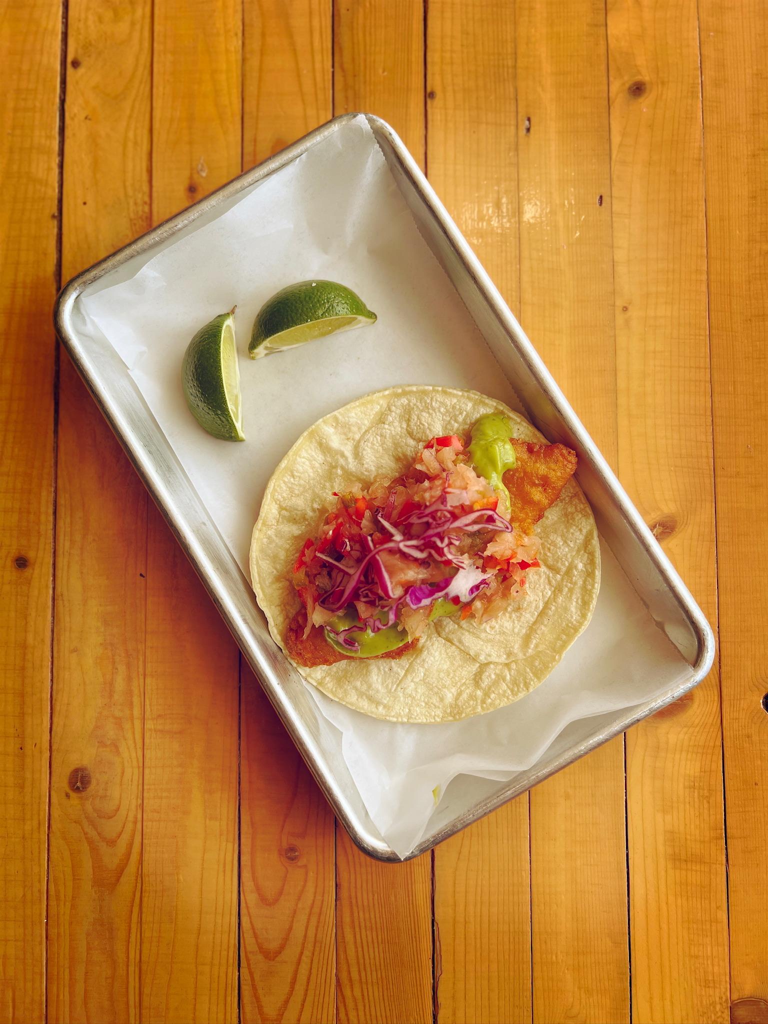 battered cod, avocado salsa, housemade pineapple salsa, crisp red cabbage, onion, rice, beans
