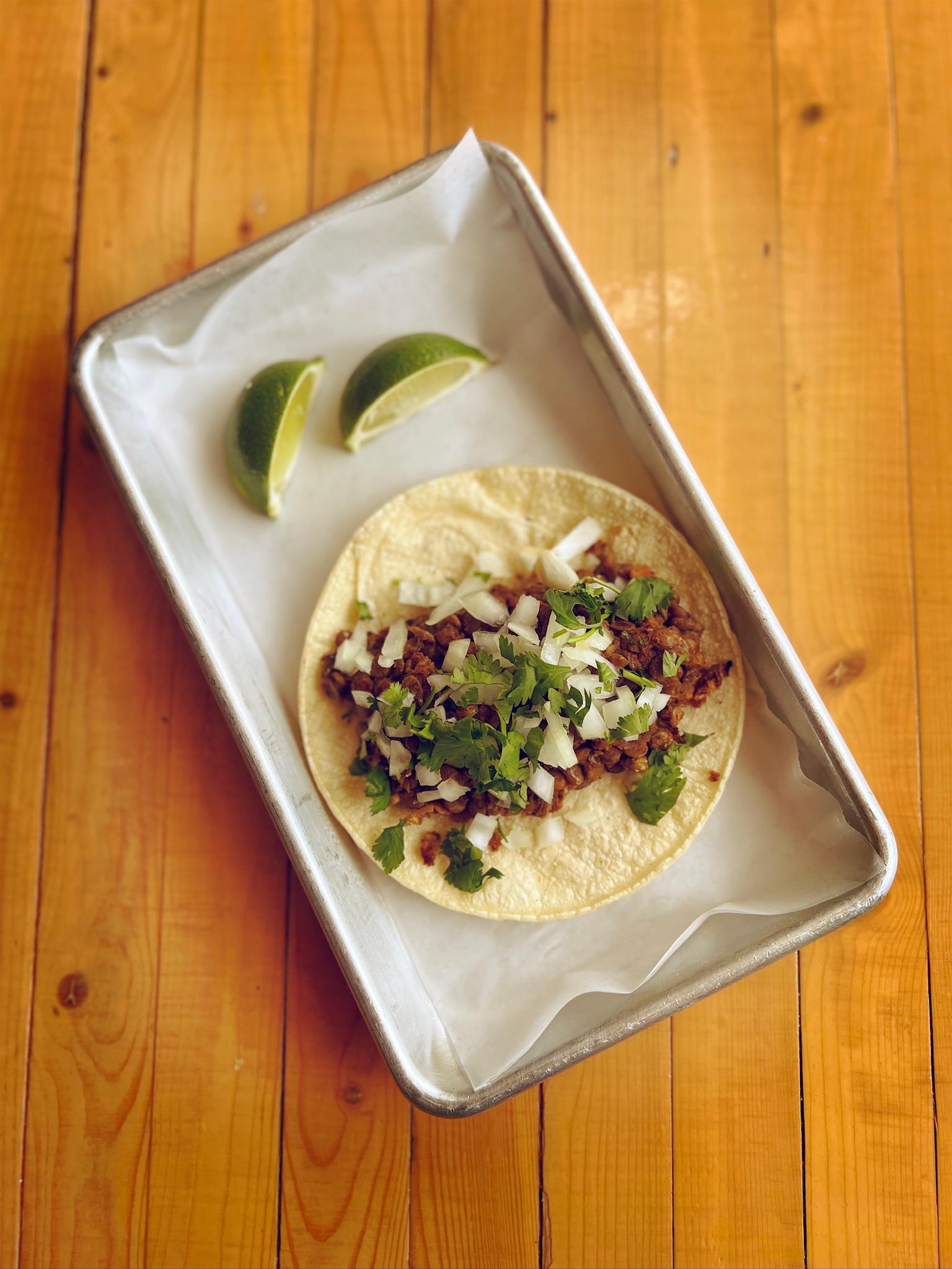 mexican style lentil chorizo, melted chihuahua cheese, onion, fresh cilantro